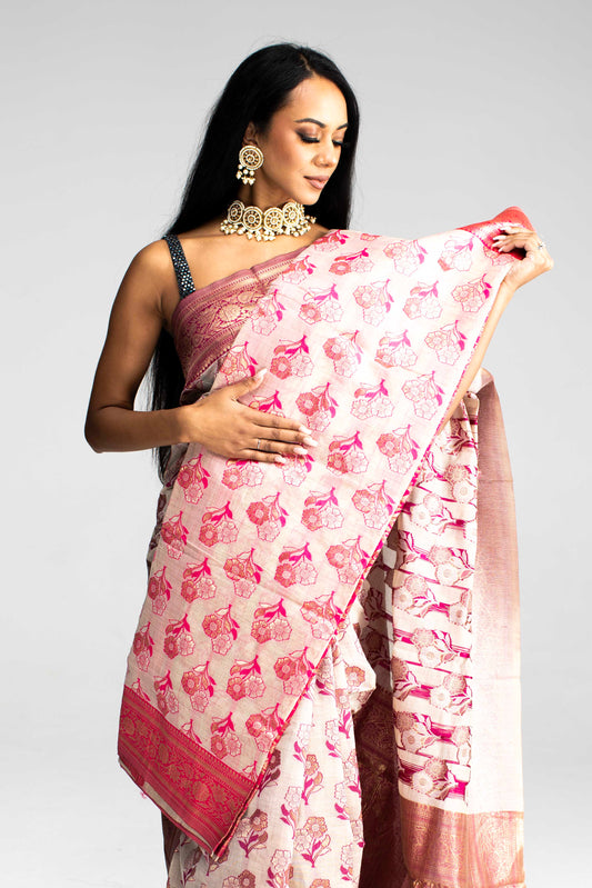 Peach Silk Saree with Floral Zari Work - ON SALE